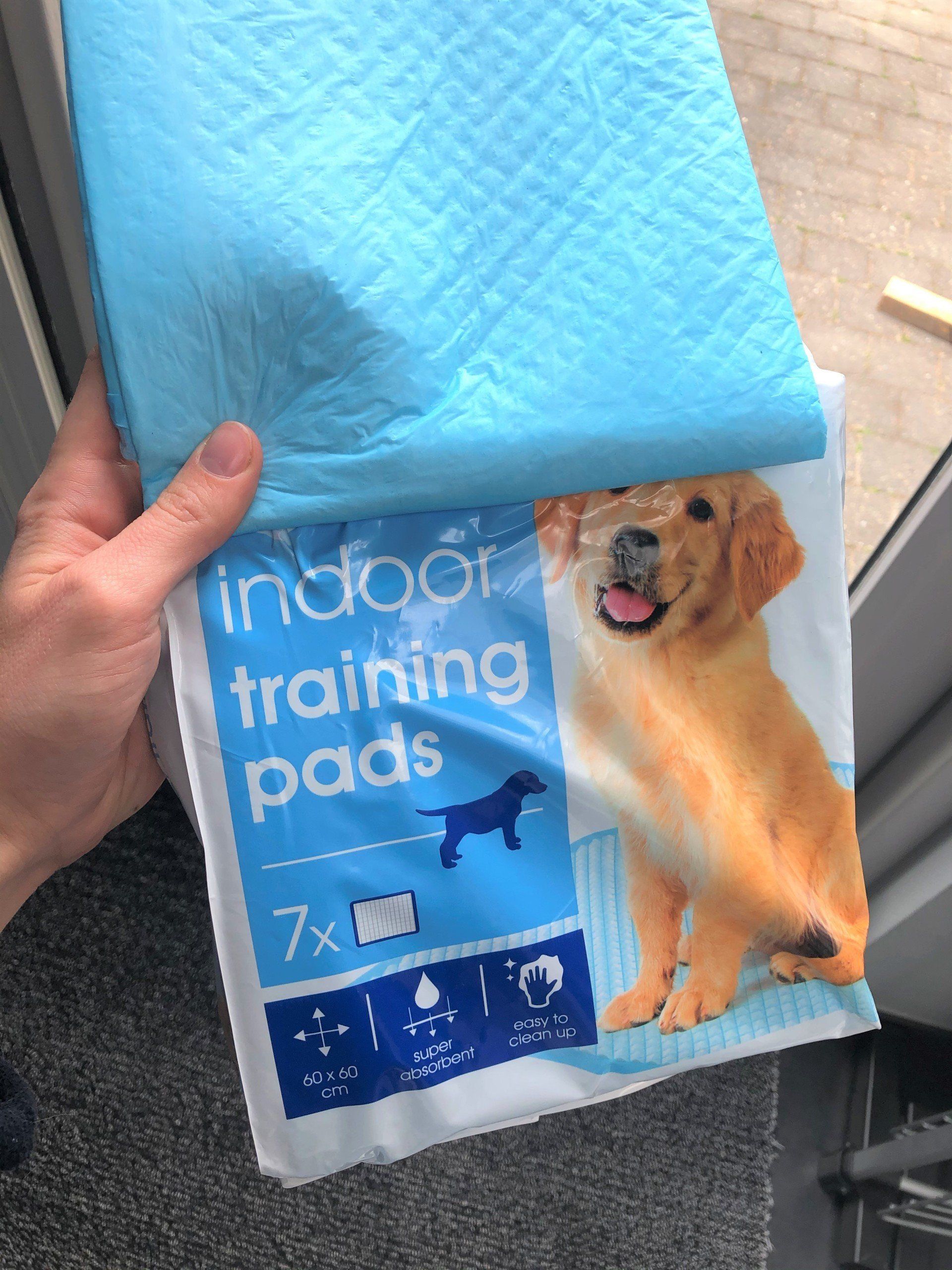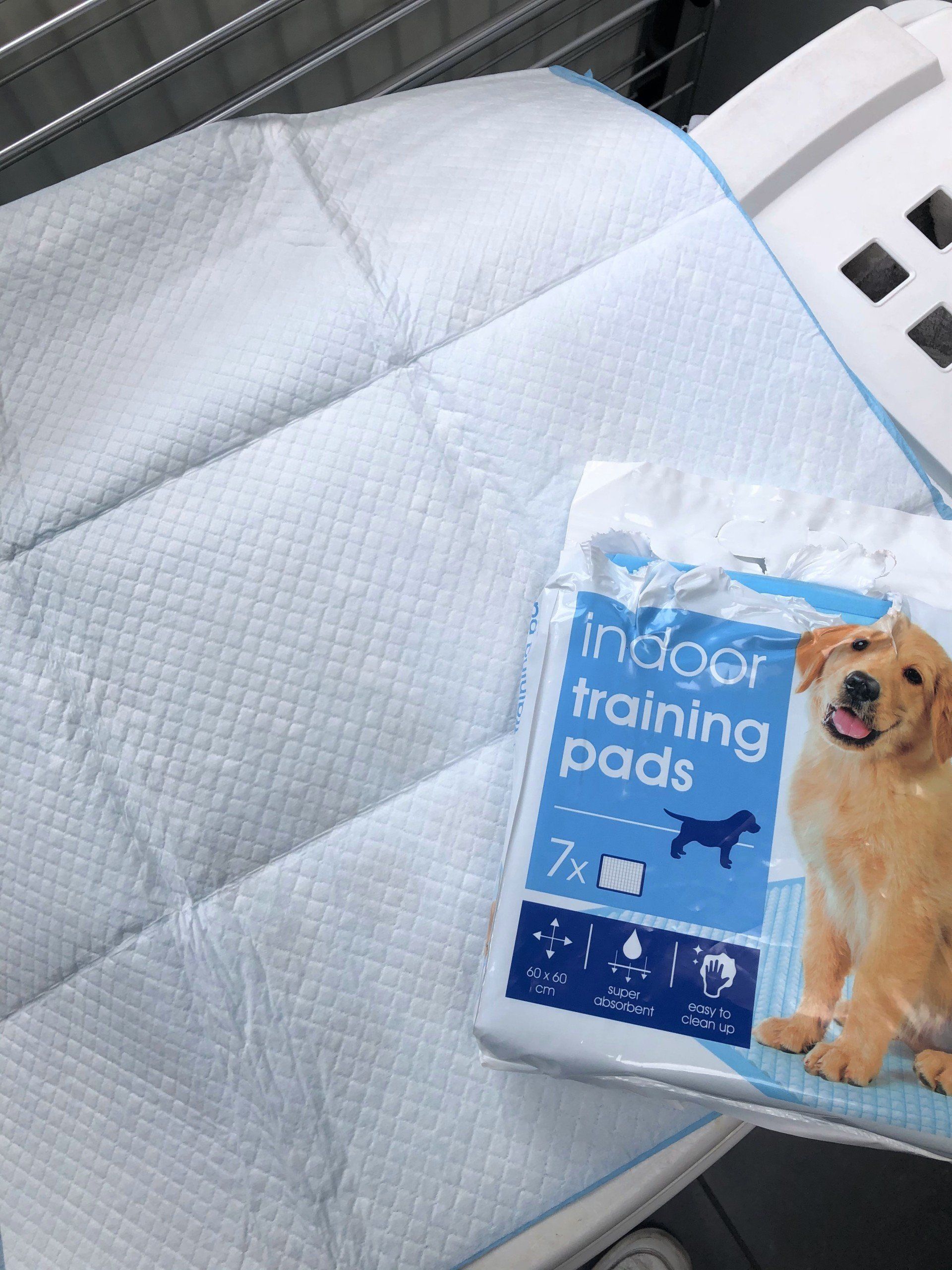 In de doos ligt een fleece-deken. Daarbovenop leggen we 'indoor training pads' van de Action. Deze absorberen veel vocht en zijn daarom ideaal voor de bevalling. Zie de foto's.
